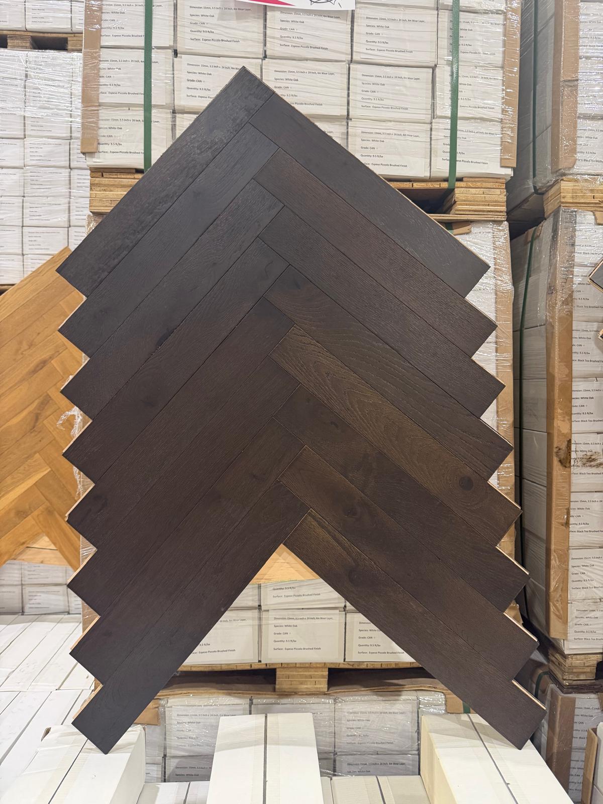 Engineered – White Oak – 3.5 Inch x 24″ x 4mm Wear Layer – CAN+ – Herringbone – Espeso – Brushed